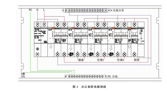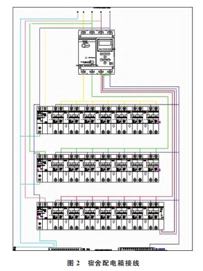 智慧用電監(jiān)管平臺設(shè)置每個(gè)宿舍由一個(gè)空氣開關(guān)控制,配電箱接線如圖2所示。每個(gè)公室由一個(gè)空氣開關(guān)控制,配電箱接線如圖3所示。每個(gè)公共區(qū)域照明燈由一個(gè)空氣開關(guān)控制,配電箱接線如圖4所示??煞謩e對各回路電流、功率進(jìn)行設(shè)定,當(dāng)回路電流或功率超過限定值時(shí),該回路自動(dòng)跳閘保護(hù)。自由設(shè)定宿舍空調(diào)、照明及插座等每個(gè)回路的開啟和關(guān)閉時(shí)間,通過手機(jī)遠(yuǎn)程管理,同時(shí)可以按鍵自動(dòng)控制,也可以通過手動(dòng)推桿控制通斷電。一旦發(fā)現(xiàn)險(xiǎn)情,立即預(yù)警,并發(fā)送預(yù)警信息至手機(jī)應(yīng)用程序及微機(jī)端。通過告警功能、預(yù)警機(jī)制,及時(shí)發(fā)現(xiàn)配電系統(tǒng)設(shè)備、周圍環(huán)境的異常情況,以便及時(shí)進(jìn)行檢查與維護(hù),防止意外事故發(fā)生。