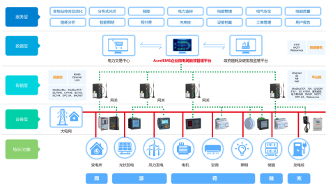 AcrelEMS企業(yè)微電網(wǎng)系統(tǒng)通過(guò)在源、網(wǎng)、荷、儲(chǔ)、充的各個(gè)關(guān)鍵節(jié)點(diǎn)安裝監(jiān)測(cè)、分析、保護(hù)、治理裝置,通過(guò)高性能邊緣計(jì)算網(wǎng)關(guān)采集數(shù)據(jù)并上傳至企業(yè)微網(wǎng)平臺(tái)。平臺(tái)根據(jù)電網(wǎng)價(jià)格、用電負(fù)荷、電網(wǎng)調(diào)度指令等情況,調(diào)整各系統(tǒng)控制策略并遠(yuǎn)程下發(fā),使企業(yè)微電網(wǎng)始終合理穩(wěn)定運(yùn)行,降低企業(yè)用電成本,實(shí)現(xiàn)能源互聯(lián)、信息互動(dòng)。