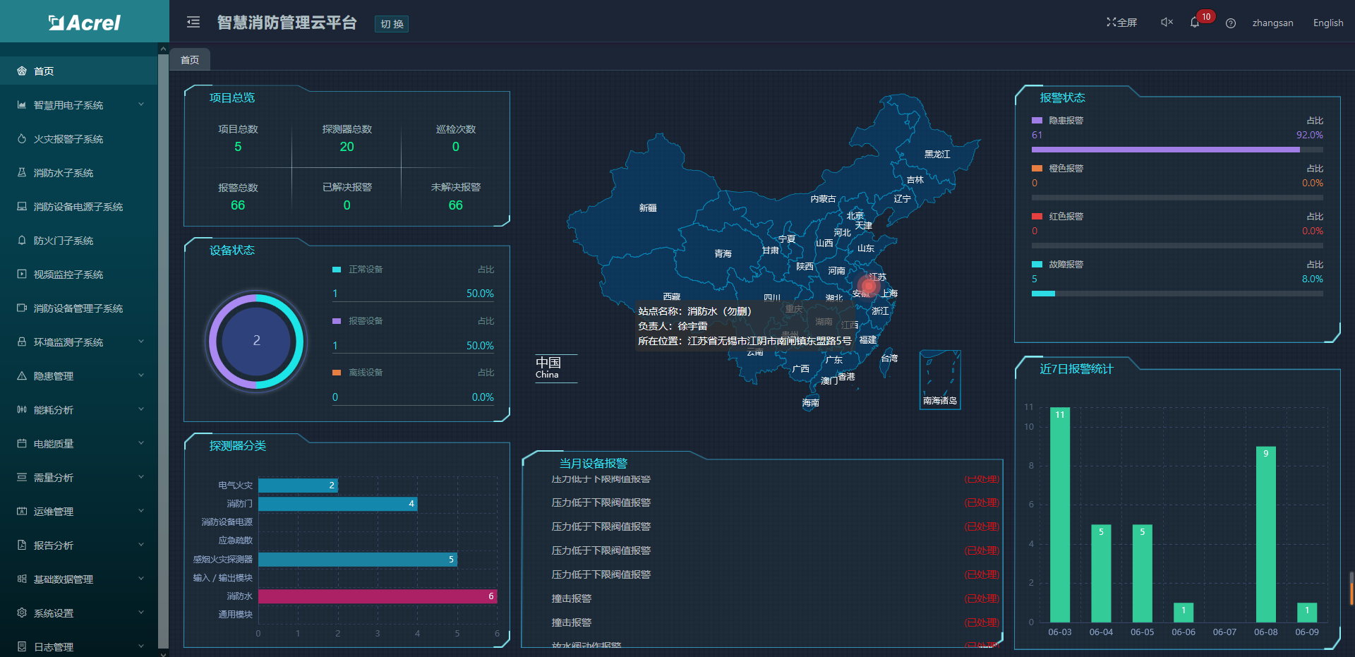 用戶登錄成功之后進(jìn)入主頁(yè),如圖所示。主要展示的內(nèi)容有:項(xiàng)目概況、設(shè)備狀態(tài)、設(shè)備分類、設(shè)備報(bào)警信息、報(bào)警分類、報(bào)警統(tǒng)計(jì)、設(shè)備臺(tái)賬信息等。其中百度地圖可以選配成BIM建筑模型,任何傳感器報(bào)警時(shí)可以在BIM模型中預(yù)警顯示。