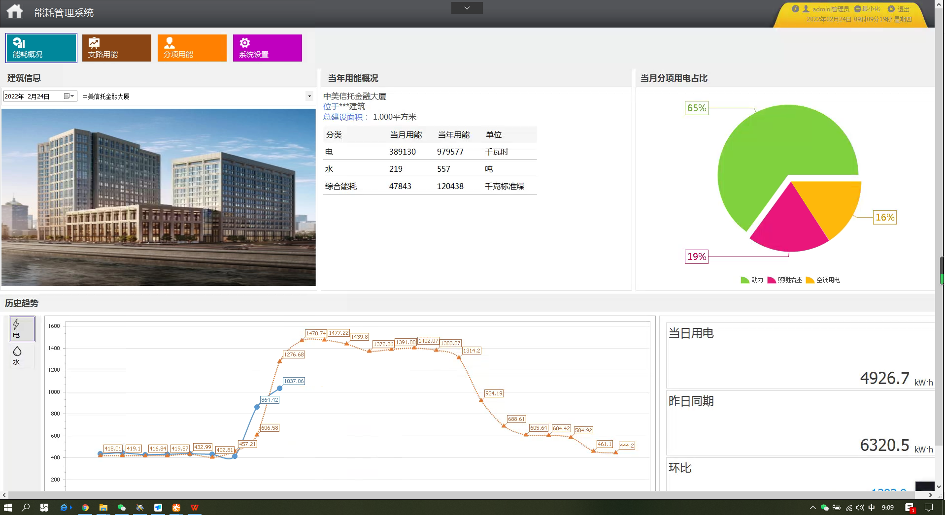 Acrel-5000能耗管理系統(tǒng)登陸成功進(jìn)入主頁面,主頁面顯示該建筑的建筑圖片,建筑基本信息,建筑當(dāng)月分項(xiàng)用電餅圖和各種能源的消耗量。根據(jù)所選的建筑,對其建筑圖片進(jìn)行加載,可以選擇時(shí)間查看建筑能耗情況,選擇建筑或時(shí)間后自動刷新,默認(rèn)為當(dāng)天。