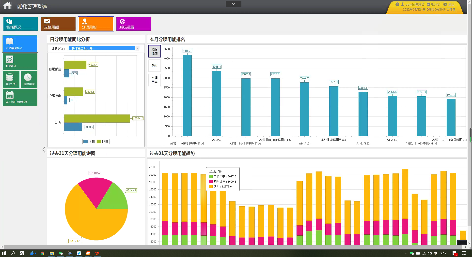 Acrel-5000能耗管理系統(tǒng)可以按照分項(xiàng)進(jìn)行能耗統(tǒng)計(jì)與顯示。其中,日分項(xiàng)用能同比分析圖顯示不同分項(xiàng)的當(dāng)日與昨日能耗柱狀圖(藍(lán)色柱表示今日,綠色柱表示昨日);用能餅圖顯示各分項(xiàng)過去31天的用能占比;堆積圖顯示各分項(xiàng)過去31天的能耗趨勢;分項(xiàng)用能排名圖顯示被選中分項(xiàng)對應(yīng)能耗值排名前10位的支路。