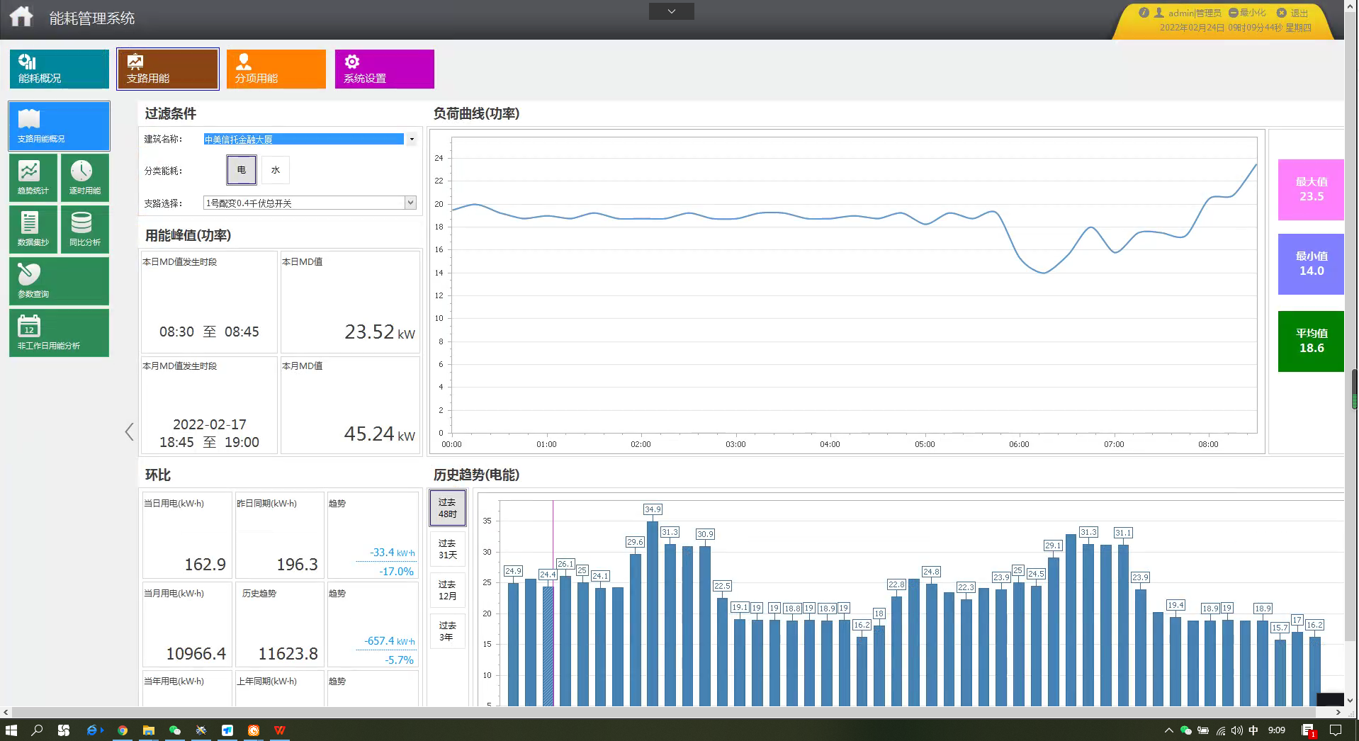 Acrel-5000能耗管理系統(tǒng)可以根據(jù)分類能耗的支路名稱查詢用能情況,顯示當(dāng)日和當(dāng)月的用能峰值(電能對應(yīng)Z大需量值)、當(dāng)日用能、當(dāng)月用能、當(dāng)年用能以及昨天同期用能、上月同期用能、上年同期用能的比較情況;以柱狀圖顯示過去48小時(shí)、31天、12個(gè)月、3年的能耗情況;以曲線圖顯示15分鐘的負(fù)荷用能走勢(電表顯示功率曲線,流量表顯示流速曲線),并顯示當(dāng)前值、15分鐘內(nèi)的Z大值和Z小值。