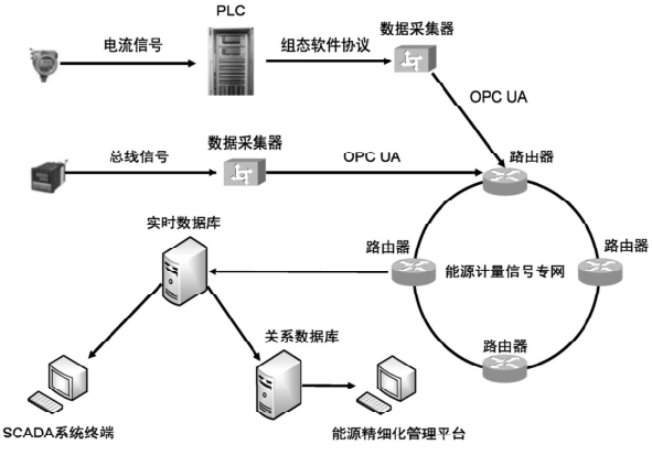 能源數(shù)據(jù)采集系統(tǒng)是整個樂鋼能源管理系統(tǒng)的基石,只有將現(xiàn)場的能源計量數(shù)據(jù)實時、準確地采集下來,才能進一步利用這些數(shù)據(jù)來指揮、調(diào)度生產(chǎn),進而調(diào)配能源生產(chǎn),提高能源使用水平。