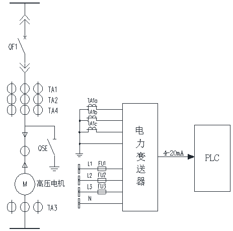 磨漿機10kV高壓系統(tǒng)電路圖如圖2所示。功率變送器通過裝在磨漿機10kV高壓電機線路中的電壓互感器和電流互感器,采集電壓和電流,從而檢測磨漿機10kV高壓電機的功率,功率變送器以4mA表示功率信號的零點,用20mA表示功率信號的滿刻度,然后將功率信號以DC4-20mA成比例關系線性輸出,傳至PLC。PLC根據(jù)功率信號動態(tài)地調(diào)節(jié)磨漿機的刀距,控制進刀或退刀,從而實現(xiàn)恒功率打漿控制。