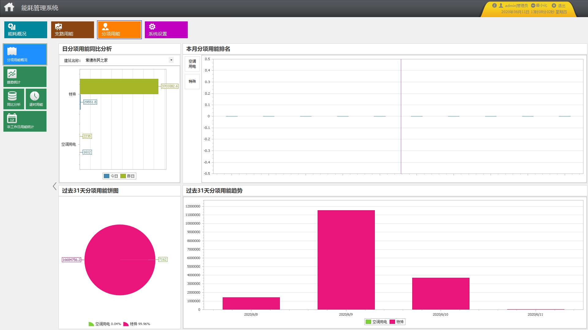 系統(tǒng)可以按照分項(xiàng)進(jìn)行能耗統(tǒng)計(jì)與顯示。其中,日分項(xiàng)用能同比分析圖顯示不同分項(xiàng)的當(dāng)日與昨日能耗柱狀圖(藍(lán)色柱表示今日,綠色柱表示昨日);用能餅圖顯示各分項(xiàng)過(guò)去31天的用能占比;堆積圖顯示各分項(xiàng)過(guò)去31天的能耗趨勢(shì);分項(xiàng)用能排名圖顯示被選中分項(xiàng)對(duì)應(yīng)能耗值排名前10位的支路。