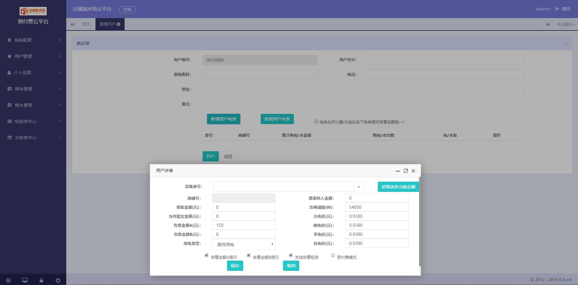 系統(tǒng)針對商鋪開戶不僅支持一戶一表,也支持一戶掛多表的需要;同時支持和解決了項目改造后新老表切換時,老表金額轉(zhuǎn)入的問題;支持峰谷電價,支持一表一電價;可對單表設(shè)置功率過載的閾值,也支持設(shè)置單表金額報警的兩級閾值。