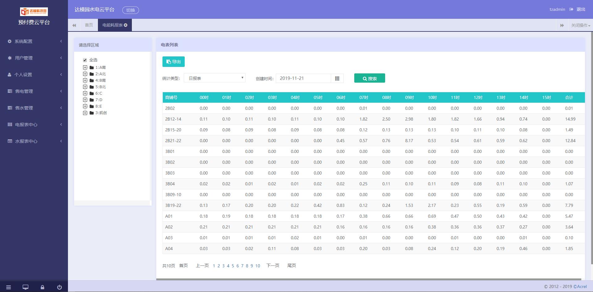 系統(tǒng)還提供了多個報表以供查詢,分別是日/月/年財務(wù)銷售統(tǒng)計報表、失聯(lián)表/通訊管理機查詢報表、開戶充值查詢報表、能耗查詢報表、實時報警/歷史報警查詢報表,支持導(dǎo)出。以下是財務(wù)報表和預(yù)付費表日用能查詢報表: