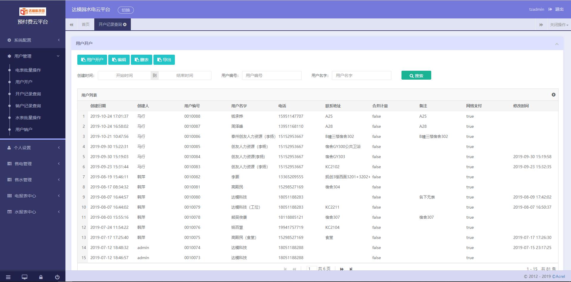用戶和管理員都可查詢預(yù)付費表或管控表每天的用能狀況;可提供能耗分析+財務(wù)軌跡一體式綜合管理報表,包含用戶表的能耗、財務(wù)數(shù)據(jù)、能耗和財務(wù)的期初期末值等數(shù)據(jù)