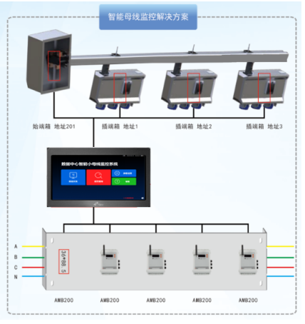 母線智能監(jiān)控系統(tǒng)由智能母線監(jiān)控裝置、電流互感器、母線接頭測(cè)溫裝置、無(wú)線通訊終端和觸摸屏組成。