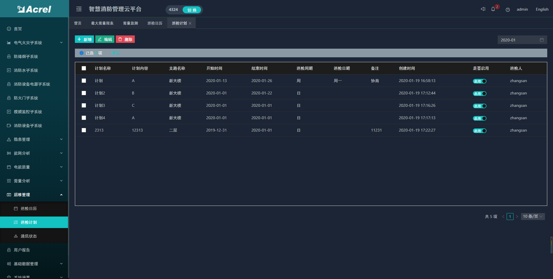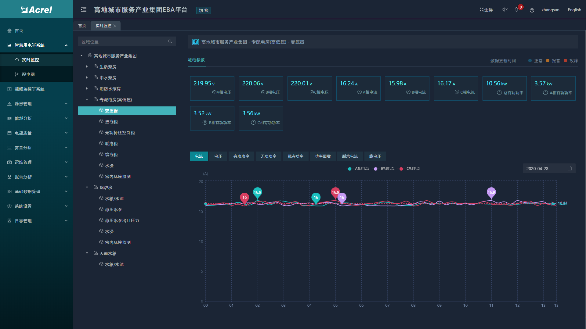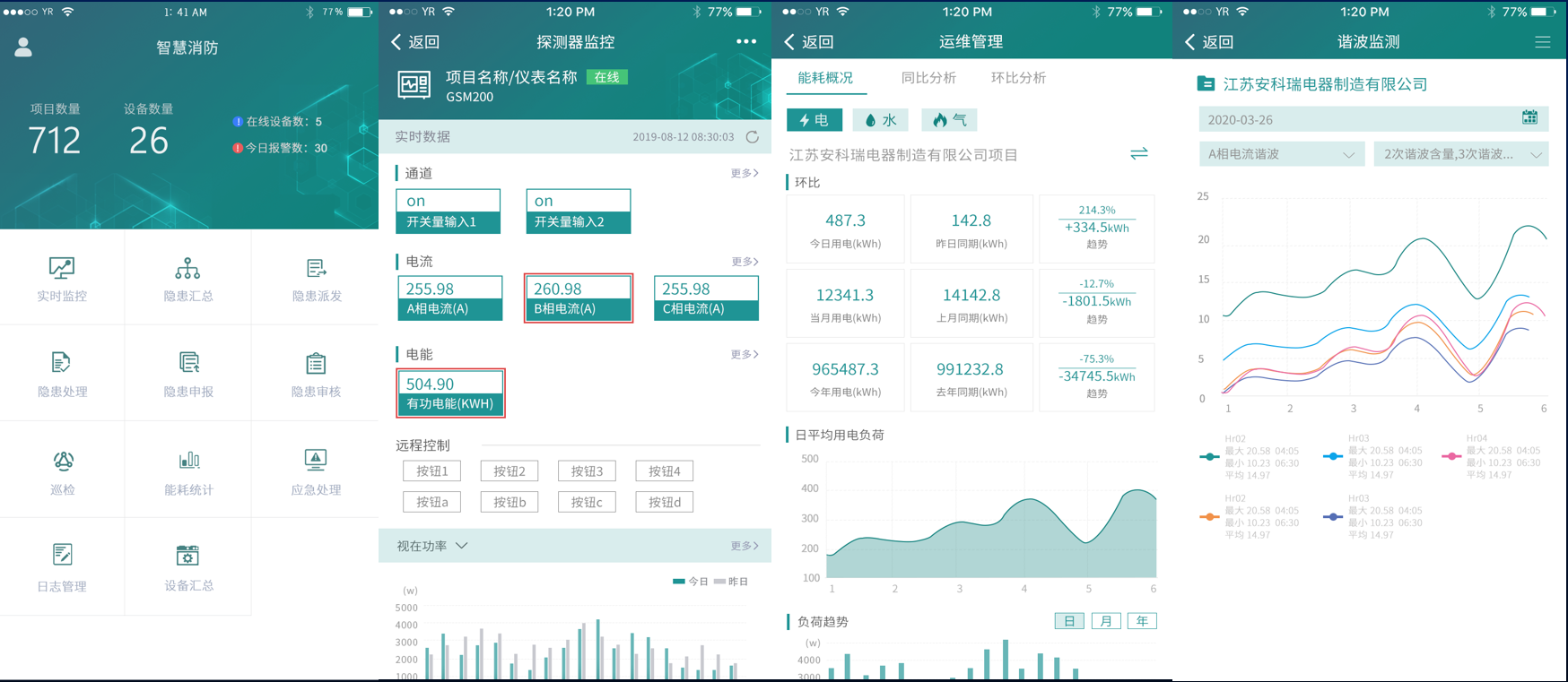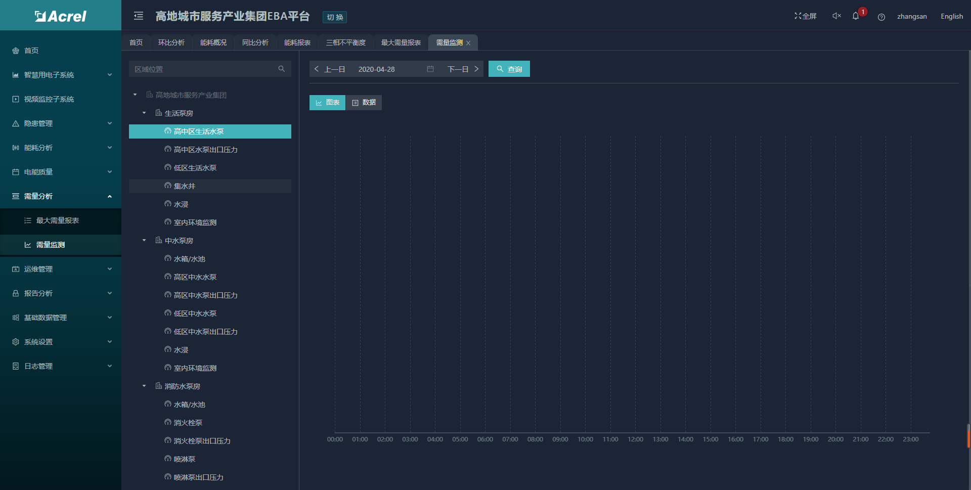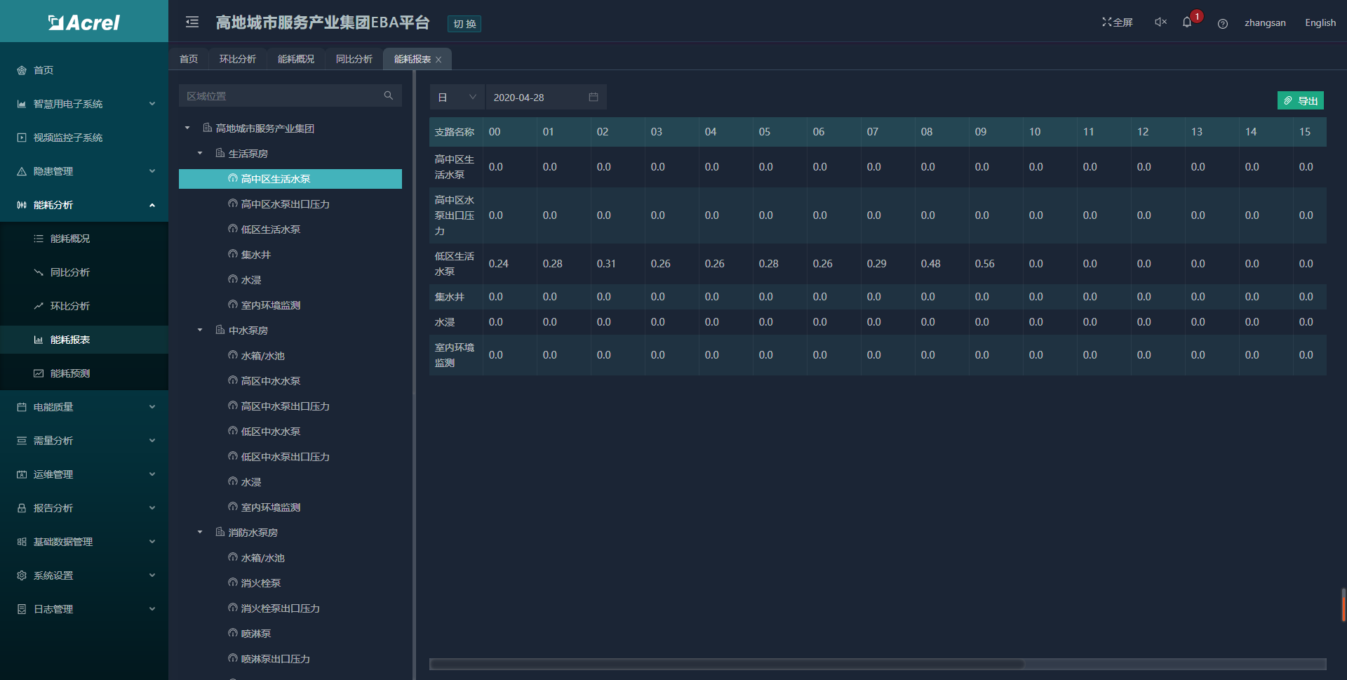針對智慧用電部分,系統(tǒng)提供能耗分析功能,按回路可查詢日、月、年的能耗報表和曲線。