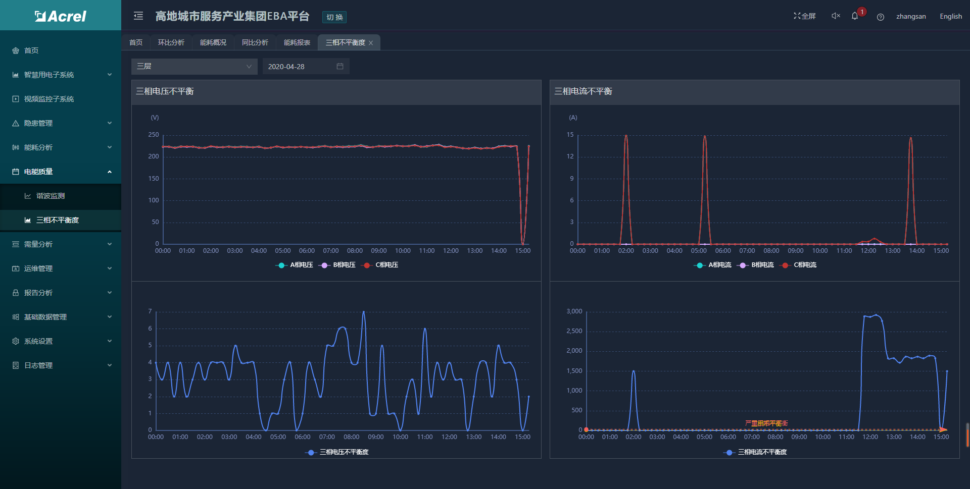 系統(tǒng)提供諧波監(jiān)測和三相不平衡分析功能。