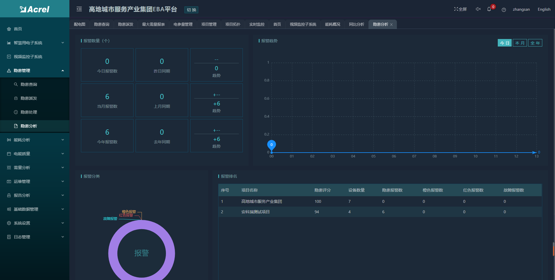 系統(tǒng)在產生報警或隱患后,系統(tǒng)可以針對工程人員派發(fā)工單,處理完以后工程人員能夠在系統(tǒng)中填寫相關工單任務記錄,以供歷史查詢。隱患統(tǒng)計支持對項目進行日、月、季、年的維度查詢,并能夠自定義時間查詢,將項目下隱患以曲線,圖表的形式展現(xiàn)。