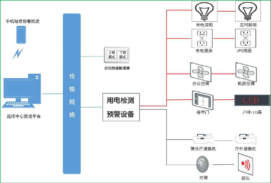 目前銀行營業(yè)場所(營業(yè)網(wǎng)點、自助銀行及辦公大樓等)的用電系統(tǒng)還處于無網(wǎng)絡(luò)化、無智能化的單機分散獨立運行的狀態(tài),主要還是采取傳統(tǒng)的保護措施,以空開、保險絲、漏保、定時器等方式為主流,無法實現(xiàn)對前端強電系統(tǒng)進行遠(yuǎn)程實時監(jiān)測和管理。