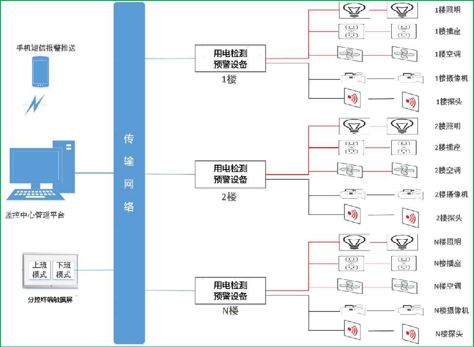 系統(tǒng)應(yīng)能夠?qū)﹄妷?、電流、溫度、電弧等進行實時監(jiān)測并進行數(shù)據(jù)分析,對被保護線路的過壓、過載、過流、過溫、欠壓、打火、缺相、設(shè)備不在線等情況進行預(yù)警,系統(tǒng)在發(fā)現(xiàn)電氣火災(zāi)預(yù)警時,信息可多種途徑及時通知相關(guān)單位處理,確保用電線路系統(tǒng)安全。系統(tǒng)應(yīng)具有獨立完整功能,通過系統(tǒng)平臺及前端系統(tǒng)設(shè)備實現(xiàn)對電氣火災(zāi)風(fēng)險的檢測預(yù)警及管理,系統(tǒng)應(yīng)預(yù)留與其他應(yīng)用系統(tǒng)、設(shè)備交互對接接口,確保系統(tǒng)擴展性及融合性。