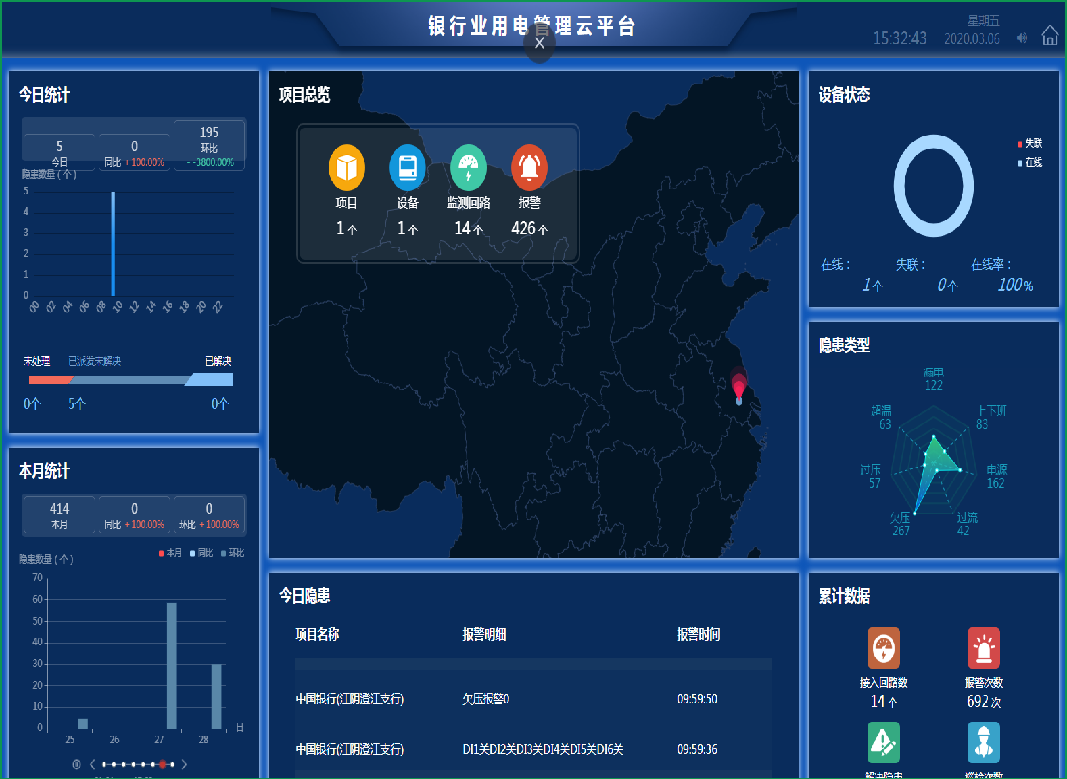 展示頁面:方便用戶在大屏幕上面展示所轄項目的概括,隱患的統(tǒng)計,分類等信息。循環(huán)展示今日產(chǎn)生的報警信息