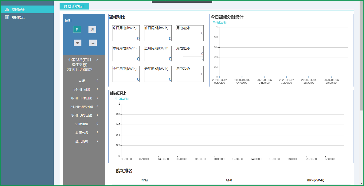 能耗頁面:針對各個網(wǎng)點或者場所,平臺能夠針對整個網(wǎng)點或者單個回路,按照年、季度、月、日或者小時,對能耗進行查詢并統(tǒng)計,并對每個回路進行能耗的排名。