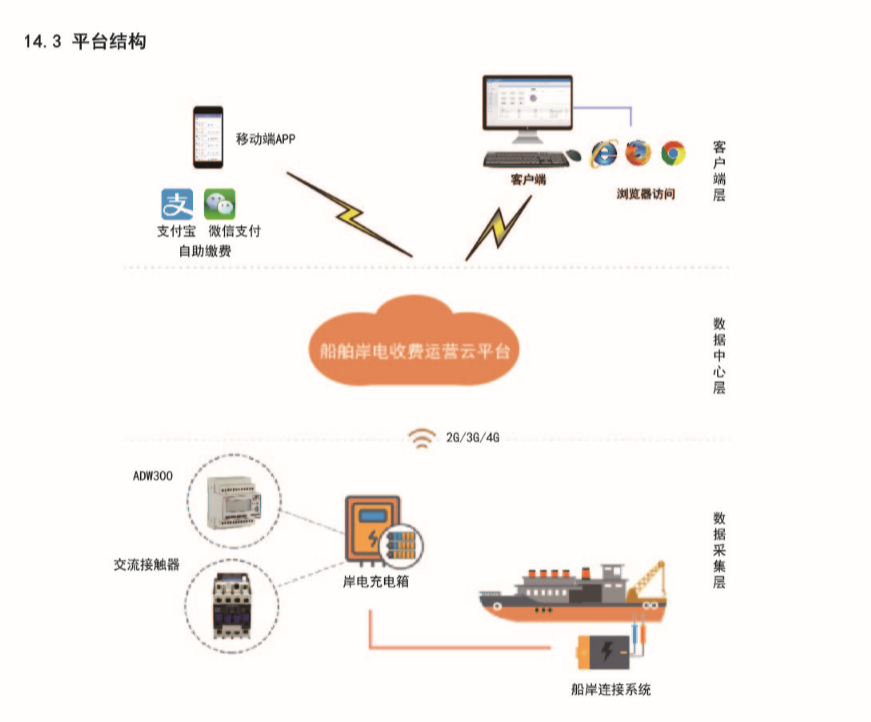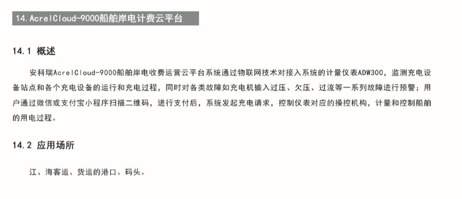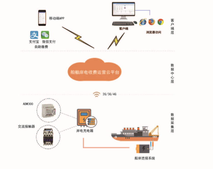 安科瑞AcrelCloud-9000船舶岸電收費(fèi)運(yùn)營云平臺系統(tǒng)通過物聯(lián)網(wǎng)技術(shù)對接入系統(tǒng)的計量儀表ADW300,監(jiān)測充電設(shè)備站點(diǎn)和各個充電設(shè)備的運(yùn)行和 充電過程,同時對各類故障如充電機(jī)輸入過壓、欠壓、過流等一系列故障進(jìn)行預(yù)警;用戶通過微信或者支付寶小程序掃描二維碼,進(jìn)行支付后,系統(tǒng)發(fā)起充電請求,控制儀表對應(yīng)的操控機(jī)構(gòu),計量和控制船舶的用電過程。