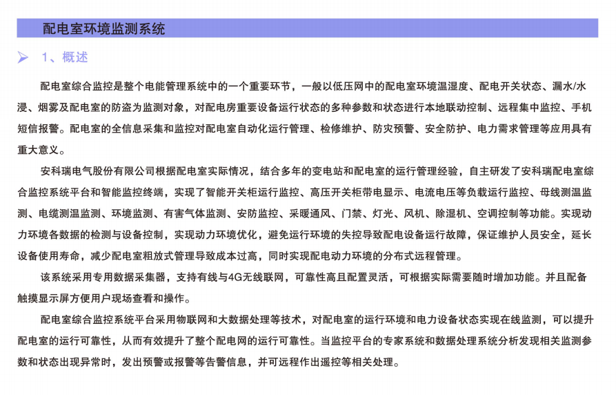 配電室綜合監(jiān)控是整個(gè)電能管理系統(tǒng)中的一個(gè)重要環(huán)節(jié),一般以低壓網(wǎng)中的配電室環(huán)境溫濕度、配電開關(guān)狀態(tài)、漏水/水浸、煙霧及配電室的防盜為監(jiān)測(cè)對(duì)象,對(duì)配電房重要設(shè)備運(yùn)行狀態(tài)的多種參數(shù)和狀態(tài)進(jìn)行本地聯(lián)動(dòng)控制、遠(yuǎn)程集中監(jiān)控、手機(jī)短信報(bào)警。配電室的全信息采集和監(jiān)控對(duì)配電室自動(dòng)化運(yùn)行管理、檢修維護(hù)、防災(zāi)預(yù)警、安全防護(hù)、電力需求管理等應(yīng)用具有重大意義。